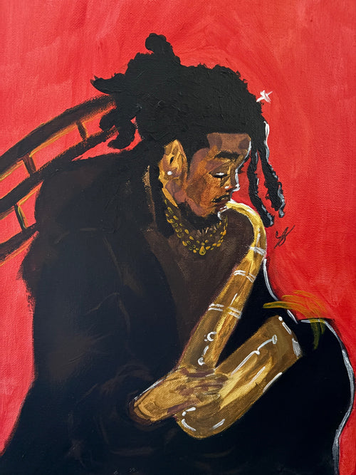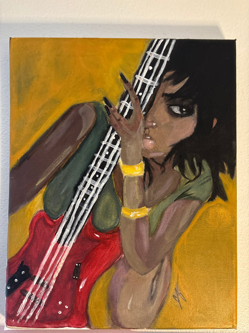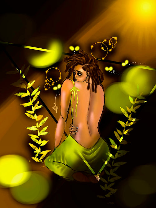 digital piece woman in a warm backdrop, aesthetic nice for home decor, theme oranges, yellow, browns and green